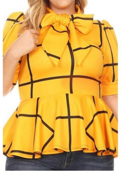 Black and Yellow blocked patterned short sleeve peplum with bow.