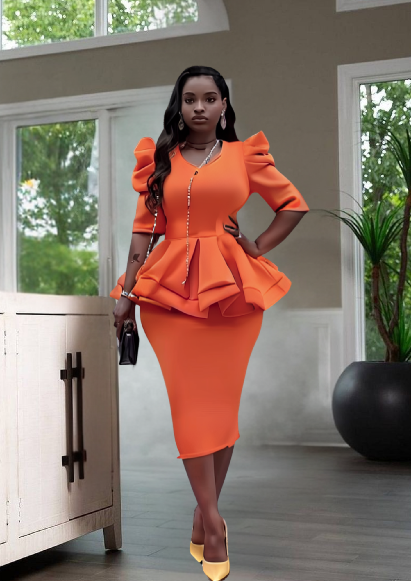 Elevate your wardrobe with our Burnt Orange Luxe Ruffle Dress (Ladi Janelle) — a rich, earthy tone that brings elegance and depth to your style. Designed with signature ruffle details and a flattering pencil-cut fit, this dress is ideal for formal events, corporate functions, or stylish evening affairs.